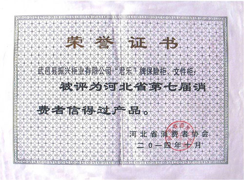 河北省消費(fèi)者信得過產(chǎn)品證書